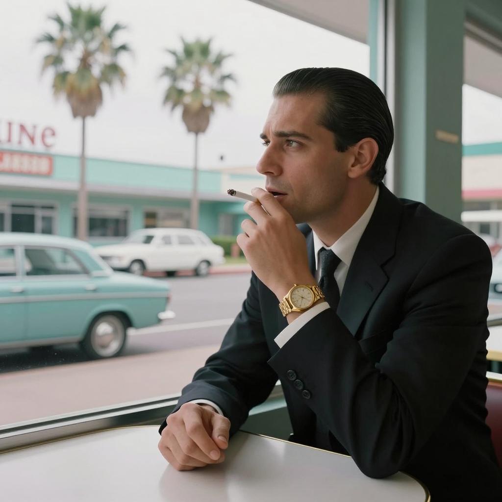 Man in green suit and white shirt, holding a silver cigarette holder to his mouth, eyes closed. Background: triangular array of warm, illuminated lights. Man has short dark hair, clean-shaven, wearing a green jacket with a white pocket square. Hand with green ring visible. Blurred figures in background.