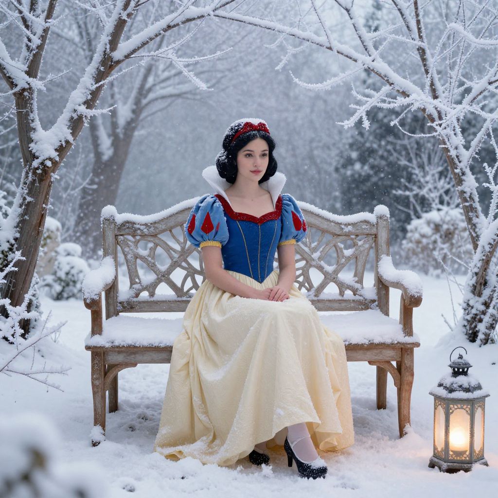 Snow white sitting elegantly on a vintage wooden bench in a snowy garden, her dark hair contrasting with pure white snow, soft glowing lanterns nearby, intricate frost patterns on branches, a calm and serene winter fantasy setting.