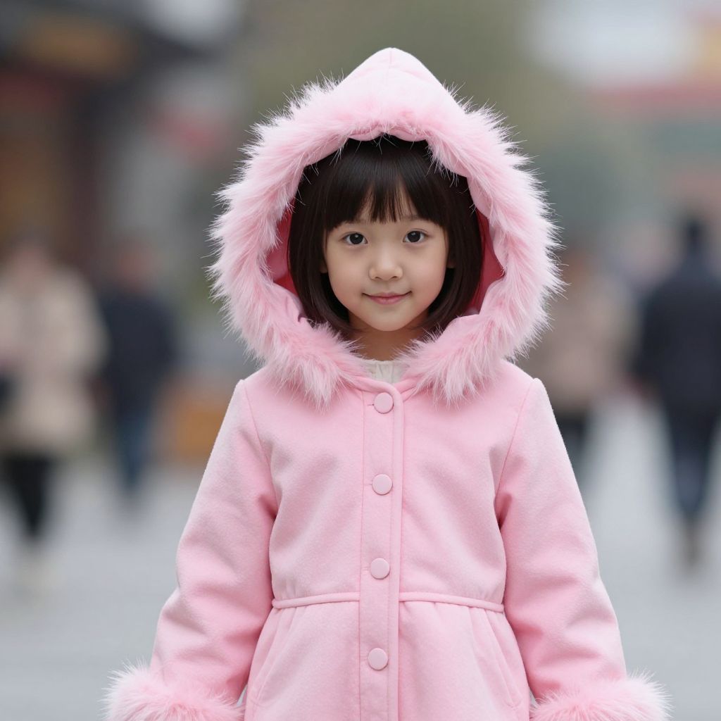Photograph of an Asian girl with straight black hair, wearing a pink hooded coat with fluffy trim, smiling outdoors in a blurred, busy urban setting