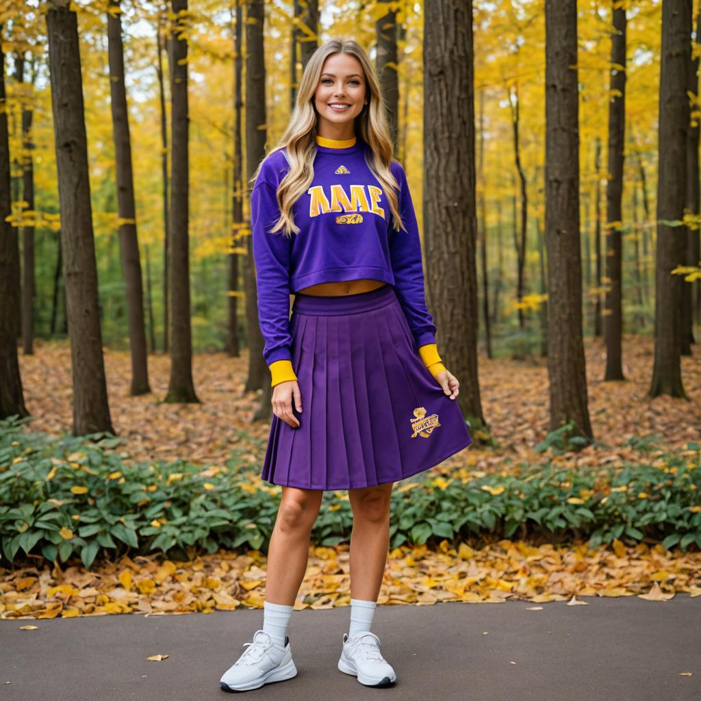 Photo of a Goldilocks Build woman, Straight Long Hair, cheerleader outfit, pleated Berry Purple skirt, crop top in Wool blended, vibrant colors, polyester, athletic style, canvas trainers, pom-poms, team logo, energetic, youthful, national park, playful dreams
