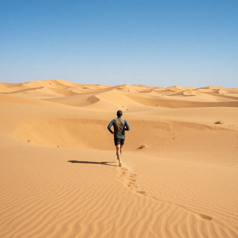 Photograph of a solitary runner, viewed from behind, traversing a vast, sunlit desert with undulating sand dunes under a clear, bright blue sky. The runner, wearing a blue shirt and dark shorts, casts a distinct shadow on the rippled, golden sand. His footsteps create a visible trail. The scene conveys a sense of isolation and adventure, with the warm, sandy hues contrasting sharply with the vivid blue sky. The texture of the sand is finely detailed, highlighting the undulating patterns and the runner's footprints.