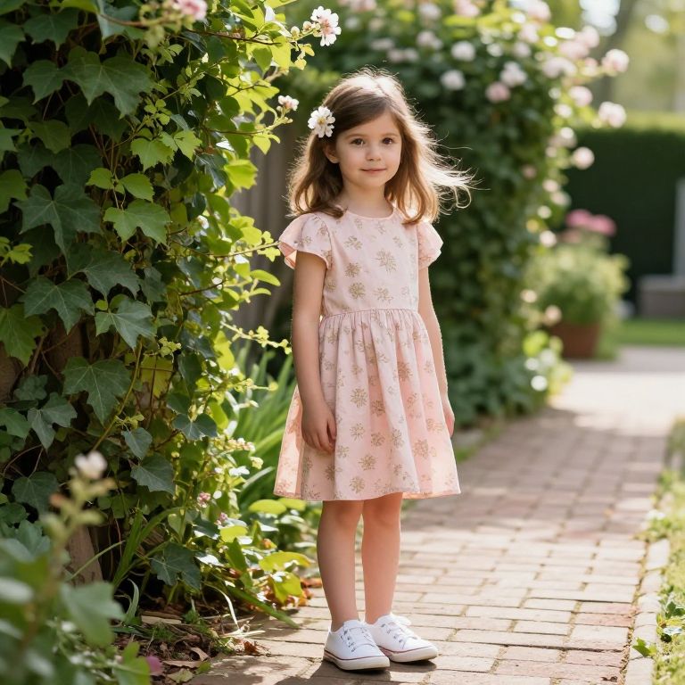 A beautiful young girl with soft brown hair, wearing a vibrant green dress adorned with a red and yellow floral pattern, and a colorful headband featuring small, fresh flowers. She stands confidently in front of a rustic wall with a thick, flowing brown curtain that gently sways in the breeze, creating a warm and inviting atmosphere. The setting is sunny and cozy, with soft natural lighting highlighting her joyful expression and the detailed textures of the dress and curtain.