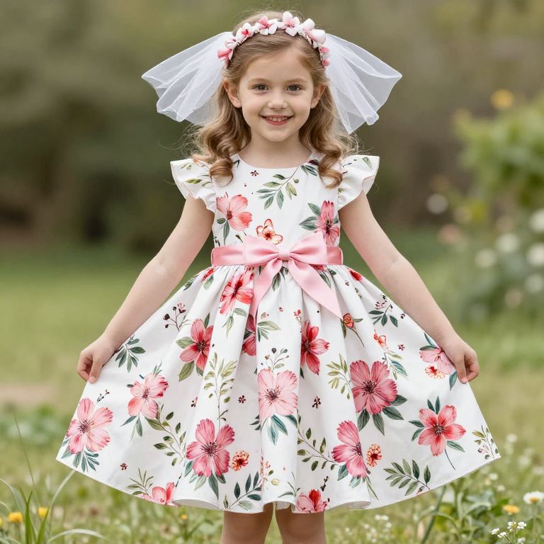 Photograph of a young girl with fair skin, brown wavy hair, wearing a green floral dress and colorful flower headband, standing against a brown