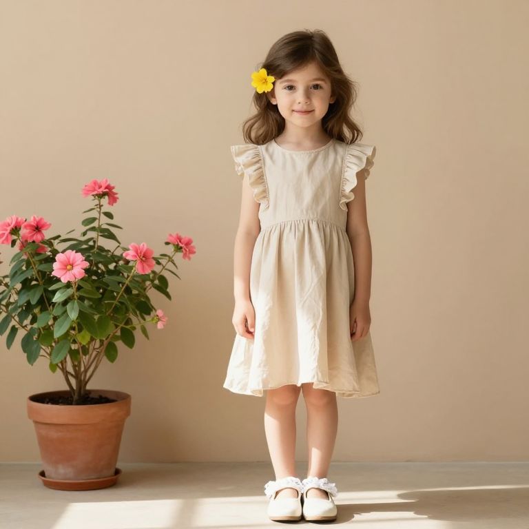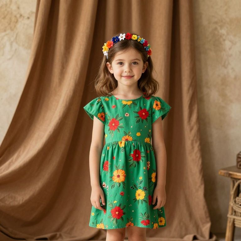 Photograph of a young girl with light brown, wavy hair standing against a backdrop of brown, draped fabric and a textured, beige wall. She wears a green dress adorned with bright red, yellow, and orange floral patterns, and a colorful flower crown on her head. The dress has short sleeves and a gathered waist. She stands with a slight smile, looking directly at the camera. To the right, there is a small, rustic wooden stool. The overall setting has a warm, earthy tone.