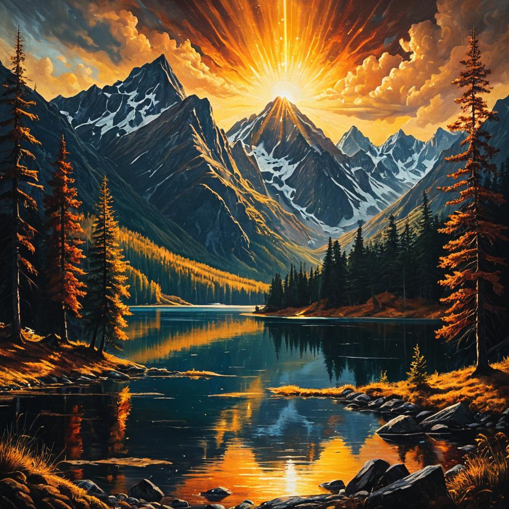 Oil painting in 16:9 aspect ratio featuring serene mountain lakes with golden rays and fiery hues, lush forests, mystical and cosmic atmosphere, inspired by nature’s beauty and earthy tones