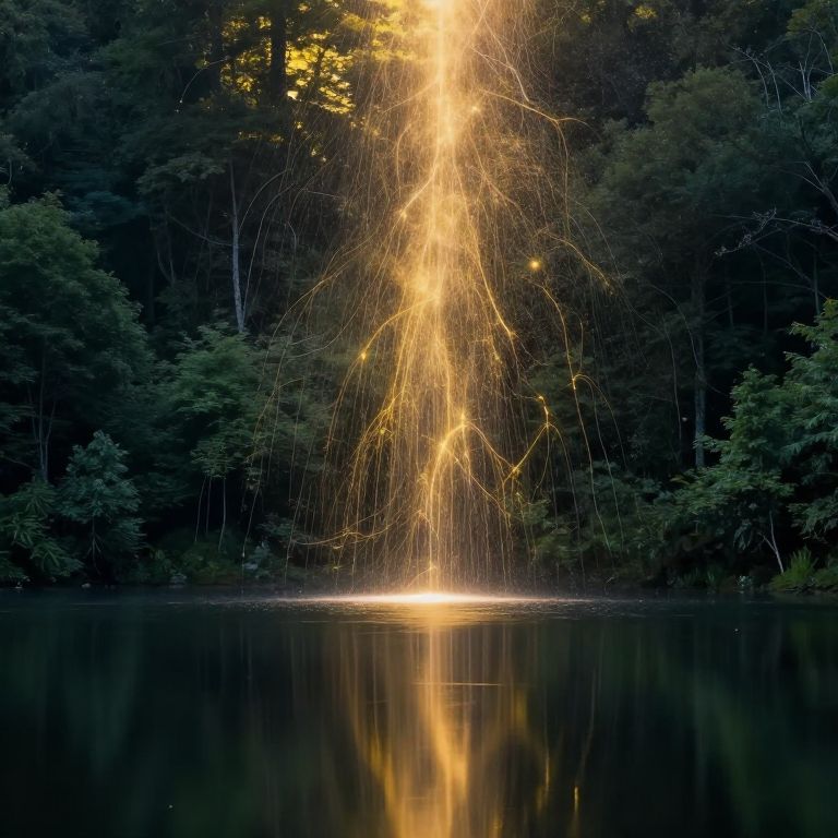 Starry light cascades vertically from a radiant celestial source, illuminating a serene forested landscape and reflecting as intricate golden tendrils upon a tranquil, mirror-like lake below.