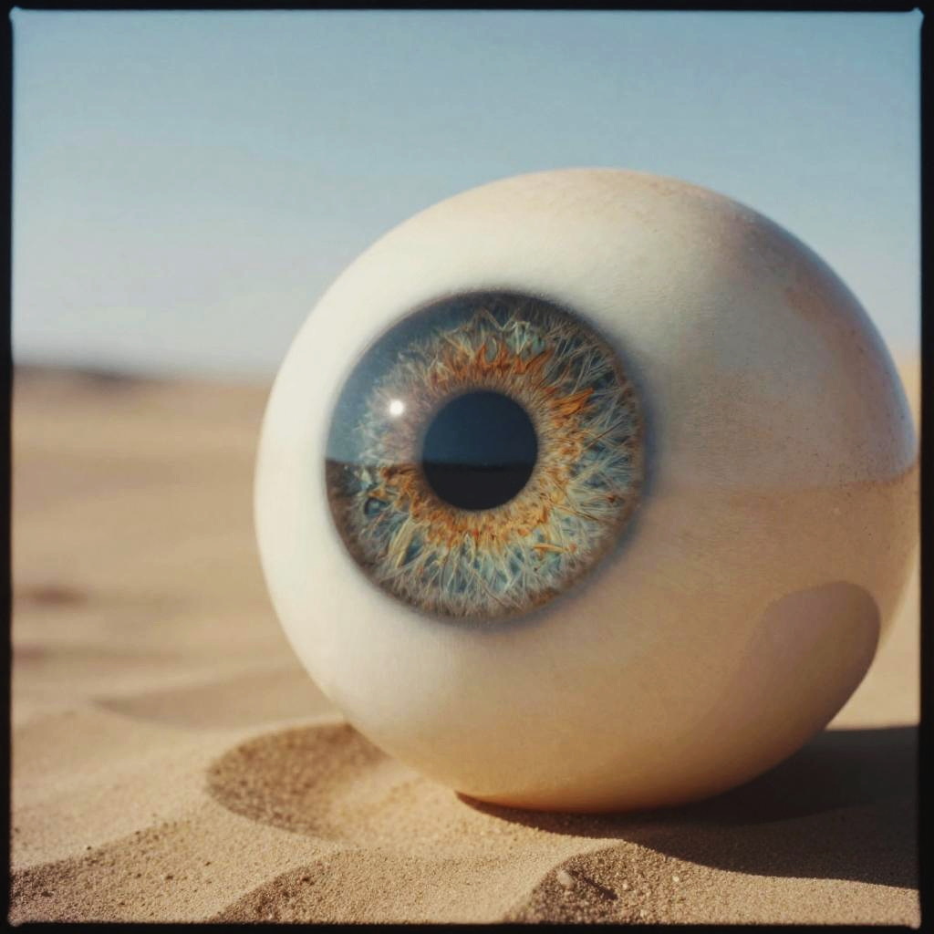 Cinematic 35mm photograph of a desert landscape that visually resembles an eyeball with a detailed iris and pupil. The image features a highly detailed and professional film-style shot with bokeh effect, showcasing the sandy texture and clear sky background.