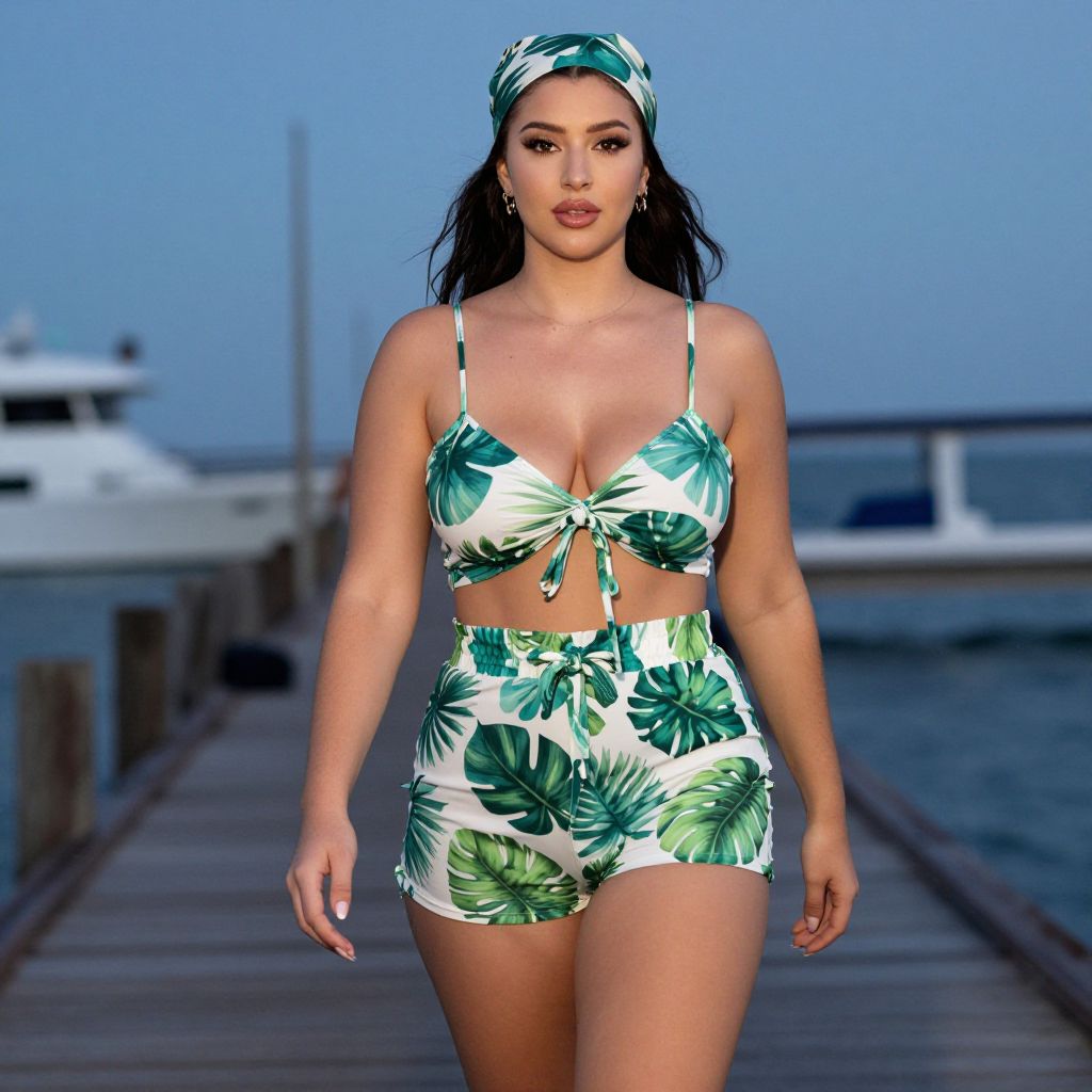A pear-shaped body type woman, Cibachrome style, wearing tropical resort wear: white and green leaf print crop top with spaghetti straps, matching high-waisted shorts with tie waistband, and a coordinated headscarf, hoop earrings, enjoying an evening walk along the pier. Sexy. Pretty face and beаutiful eyes. Big breasts
