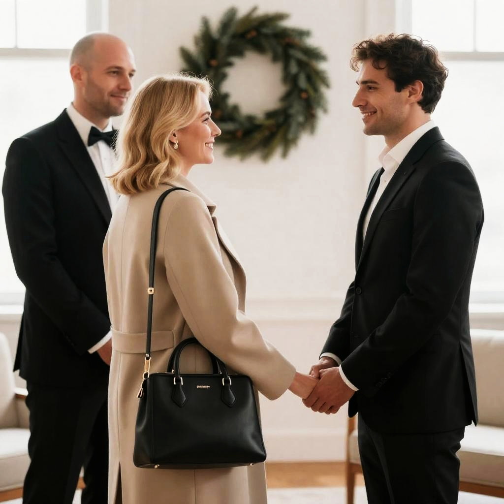 Photograph of three people in a bright room. Blonde woman with shoulder-length hair, beige coat, and black handbag holding hands with dark-haired man in black suit. Bald man in black tuxedo with bow tie stands to the left. Christmas wreath in background. Woman and man facing each other, smiling. Man on right holding woman's hand. Bright natural light.