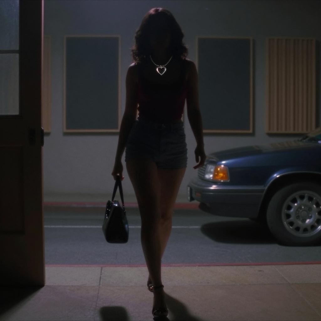 Silhouette of a mixed-race woman in her 30s walking into a music studio at night in Los Angeles. She is wearing high-waisted shorts, a sleeveless top, high heels, and a distinctive chrome hearts heart-shaped necklace. The scene features dim, moody lighting with strong shadows, a parked car on the street, and a retro 80s anime-inspired aesthetic with grainy VHS film effects.