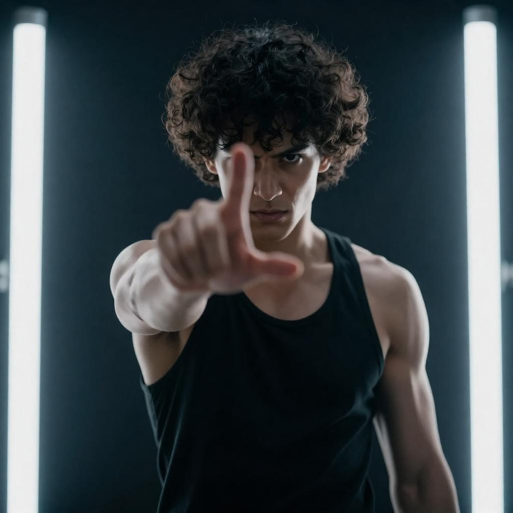 A photograph of a person with dark, curly hair and a muscular build, wearing a black tank top, extending their right hand towards the camera in a menacing gesture. The background is dark with two bright, vertical light strips on either side. The image has a blue tint, emphasizing the intensity of the subject's expression and gesture.