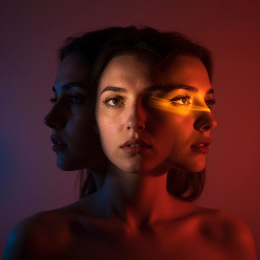 Challenge conventional notions of beauty and femininity through conceptual portrait photography. Photograph a woman in silhouette, her features distorted by reflections and shadows, while an ambient orange light beam highlights the fluidity of identity and perception. Use the Canon Mark D4 and an 50mm lens to capture the essence of ambiguity and intrigue in this thought-provoking composition. Introduce keyfill lighting with red and blue lights to enhance the contrast between light and shadow, and add a yellow beam of light to accentuate her eyes. Ensure hyper-realistic skin textures to add depth and authenticity to the image.