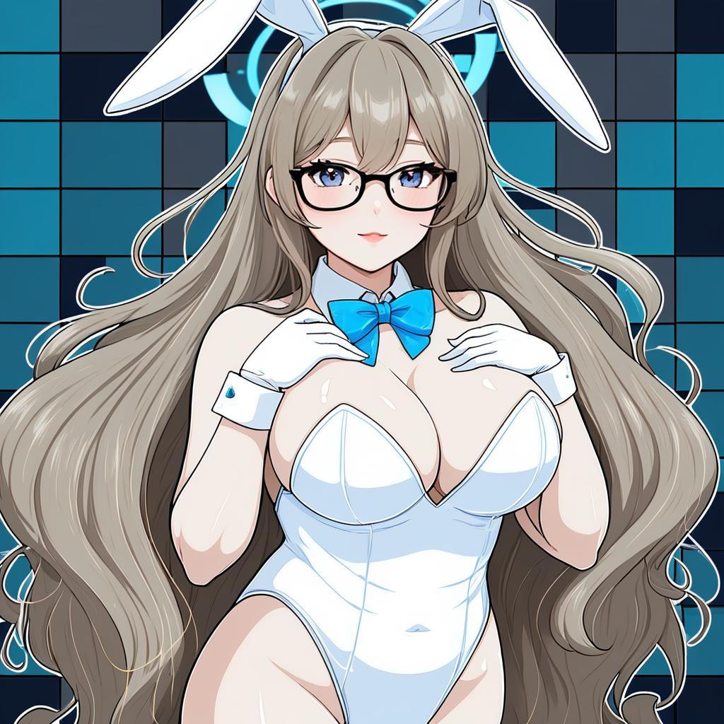 Akane (bunny) (blue archive), blue archive, 1girl, rabbit ears, fake animal ears, hair between eyes, brown eyes, glasses, black-framed eyewear, light brown hair, long hair, brown hair, very long hair, large breasts, cleavage, white leotard, strapless leotard, white gloves, halo, detached collar, bare shoulders, aqua bowtie, blue bowtie, playboy bunny, playboy bunny, shawl, by artist merunyaa, anime