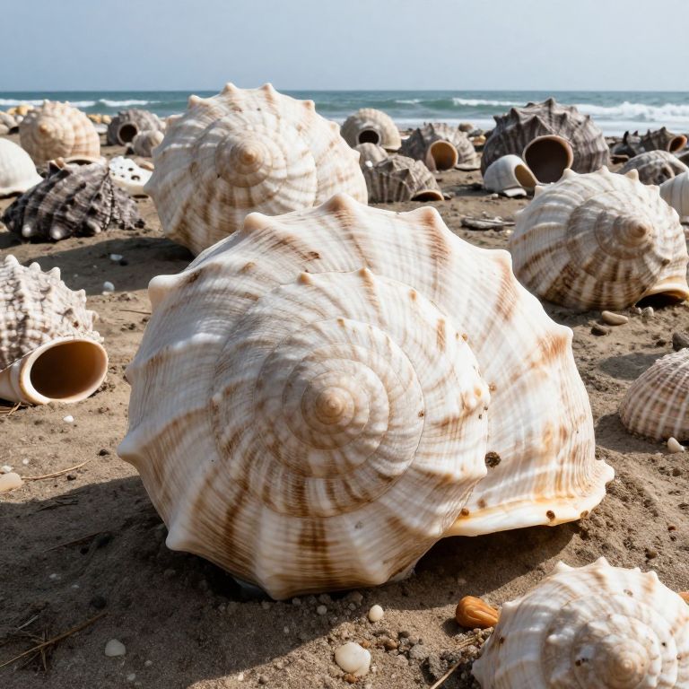 Photograph of a sandy beach scattered with large, variously shaped conch shells. The foreground features a prominently large, spiral conch shell with beige and brown stripes, casting a shadow on the sand. Smaller, similarly patterned shells and shell fragments are dispersed around it. In the background, the ocean waves gently lap the shore under a clear blue sky. The sand is a mix of brown and beige, with small pebbles and shells scattered throughout. The lighting is natural, highlighting the textures and patterns of the conch shells.