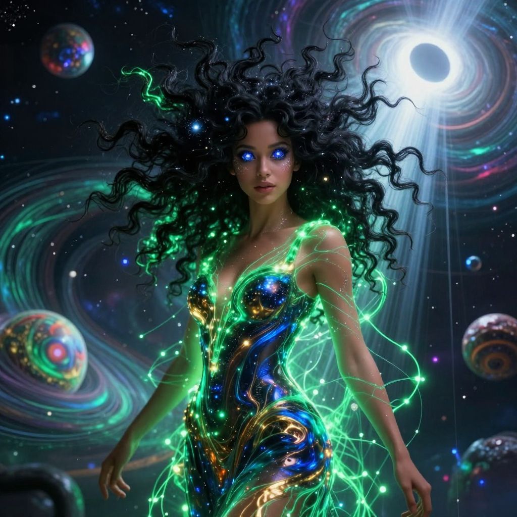 Digital art of a glowing, ethereal woman with black curly hair, blue eyes, and a neon, galaxy-patterned dress in a cosmic space with