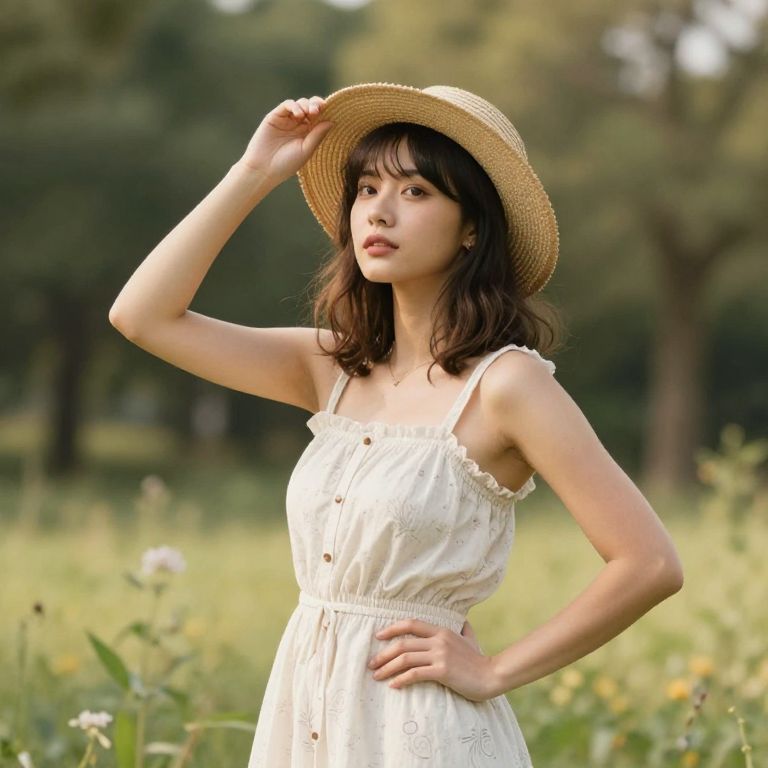 Photograph of an Asian woman standing in a sunlit meadow. She has medium-length, wavy black hair and wears a straw hat, which she holds with her right hand. Her white, sleeveless, sundress with delicate lace trim and buttons contrasts with the green, blurry background of trees and wildflowers. Her left hand rests on her hip, and she gazes thoughtfully into the distance. The sunlight casts a warm glow on her fair skin, emphasizing her natural beauty. The meadow's grass and flowers add a serene, summery feel to the image.