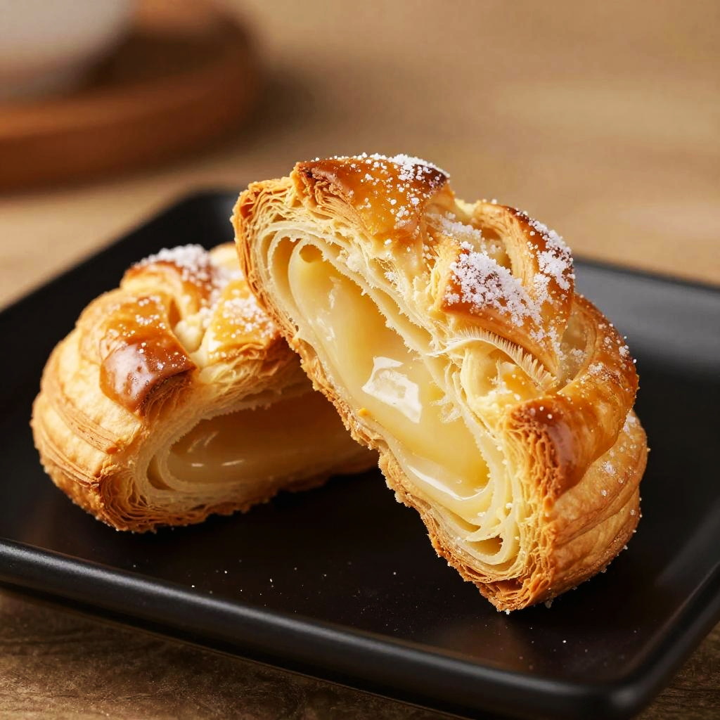 A close-up photograph of a golden-brown, flaky pastry with a slightly raised, twisted top, dusted with sugar. One slice is cut out and leaning against the main pastry on a black square plate. The background is blurred, featuring warm brown tones. The pastry has a glossy, buttery texture, and the sugar sparkles in the light.