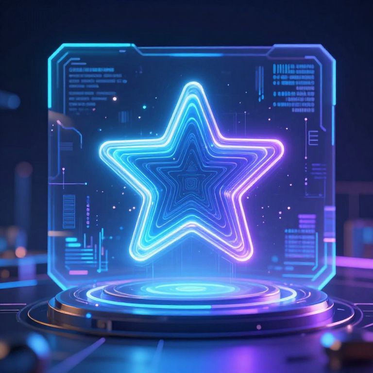 Neon blue and purple glowing star inside a futuristic, transparent, tech-themed box with digital circuits and holographic effects.