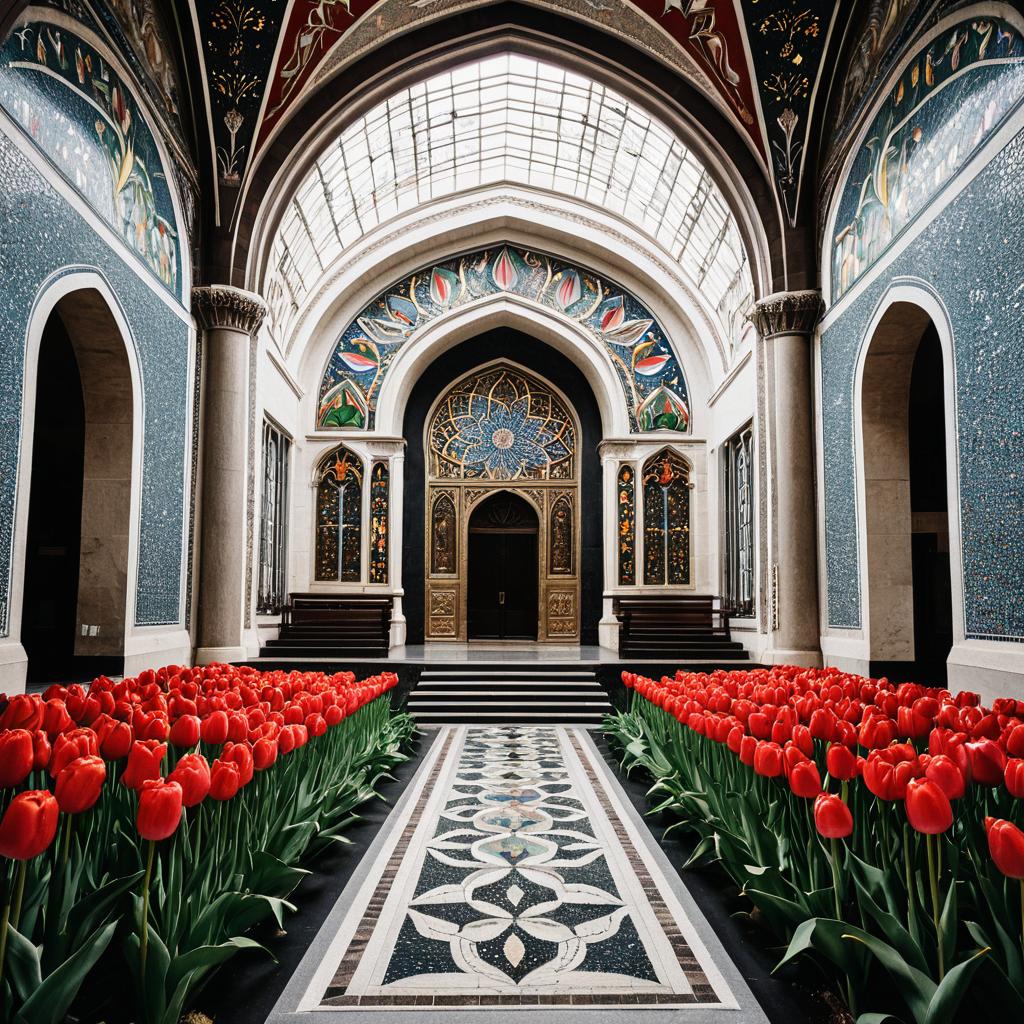 Interior architectural photograph of a synagogue inspired by red tulip flowers. The space features a grand arched entrance with intricate mosaics and frescoes depicting nature scenes. Natural light filters through a large skylight, highlighting metallic and colorful tile work. Rows of vibrant red tulips line the patterned floor pathway leading to a decorative golden door. The design combines traditional religious architecture with floral-inspired motifs and artistic detailing.