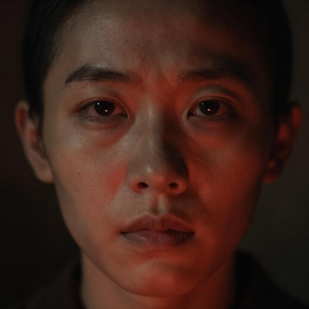Close-up photograph of a weathered, ured face with deep wrinkles and dark, hollow eyes. The face is illuminated in a reddish-orange light, highlighting the rough, cracked skin. The background is dark and indistinct, focusing attention on the face. The image has a dramatic, eerie atmosphere.
