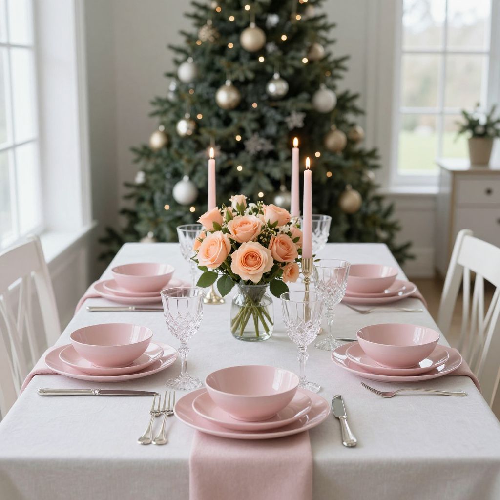 Elegant French Country Cottage table setting showcases a harmonious blend of pastel pink accents, featuring six place settings with delicate pink bowls, crystal glasses, and silverware, complemented by a central floral arrangement of peach roses and tall taper candles, all set against a backdrop of a festive Christmas tree and soft natural light streaming through large windows.