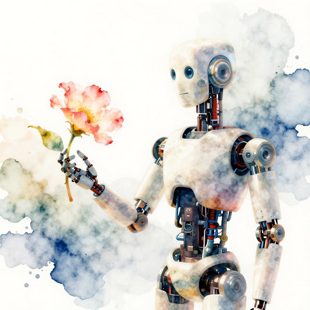 Ai watercolor scene featuring a robot gently holding a blooming flower, soft transparent pigment layers, subtle color gradients, and diffuse edges, capturing harmony between artificial intelligence and nature with a poetic, impressionistic style