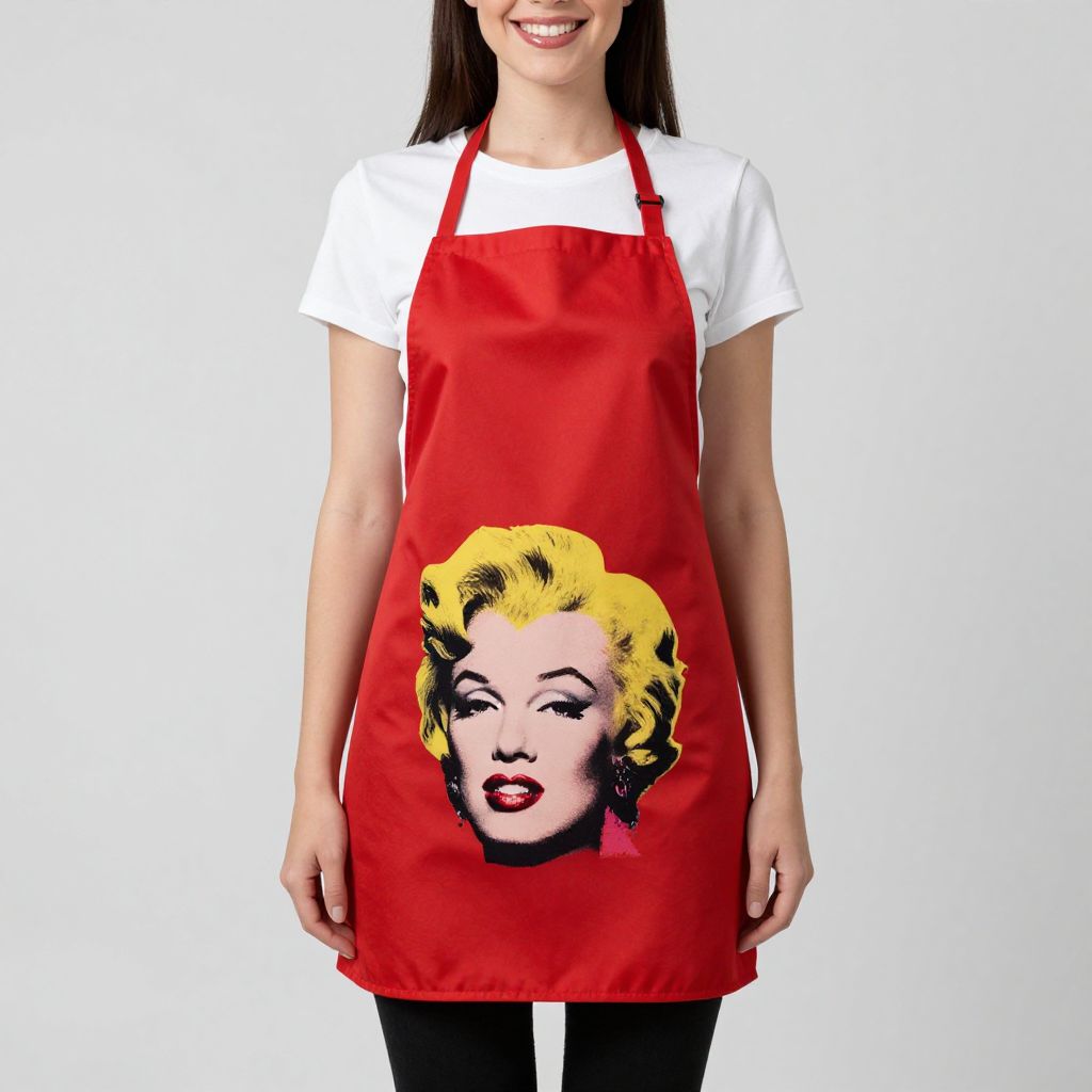 Woman wearing a vibrant red retro-style apron featuring a pop-art depiction of Marilyn Monroe's face above her waist, paired with a white T-shirt and black pants, smiling brightly against a plain background.