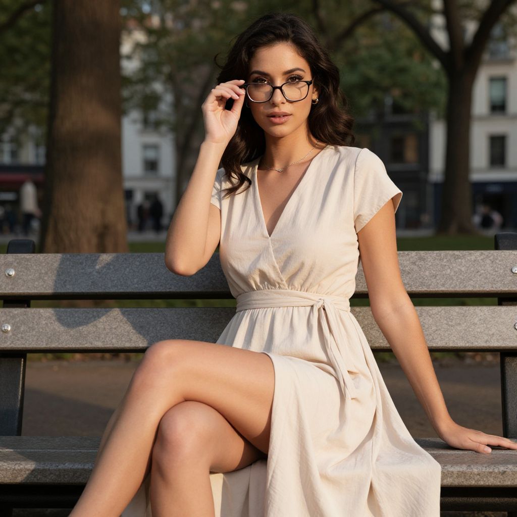 Photograph of a young woman with long brown hair, wearing large black sunglasses, gray sleeveless top, and orange skirt, sitting on a white blanket