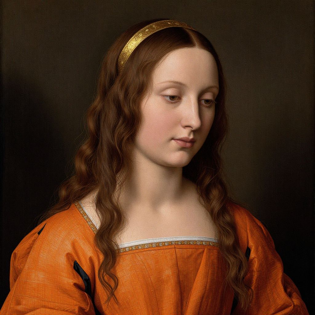 Renaissance portrait of a young girl with long, wavy brown hair, fair skin, wearing an orange dress and gold headband, against a