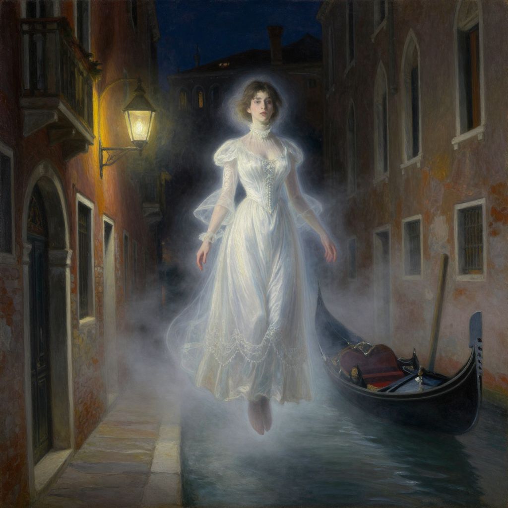 The image is an oil painting by Andrew Wyeth, featuring a transparent ghost of a Victorian woman floating above a Venice alley at night. The woman, dressed in a flowing white dress with intricate Victorian details, appears ethereal and otherworldly, her form blending seamlessly with the mystical, ground fog that envelops the scene. The alley is dimly lit by a single lantern, casting a eerie glow on the fog and highlighting the woman's ghostly presence. In the background, a gondola rests on the water, adding to the gothic atmosphere. The overall composition is masterful, with the woman's ghostly figure centrally positioned, creating a sense of depth and intrigue. The interplay of colors, textures, and shapes creates a hauntingly beautiful and surreal scene, capturing the essence of a Victorian Gothic fantasy.