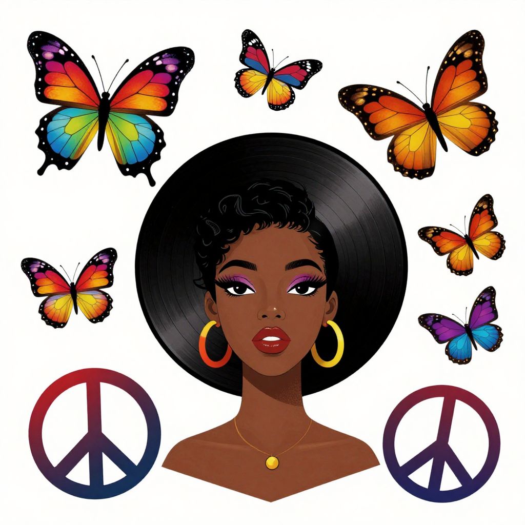 Digital illustration of a dark-skinned woman with curly black hair, colorful butterflies, star, and peace symbols, wearing gold hoop earrings, with a vinyl