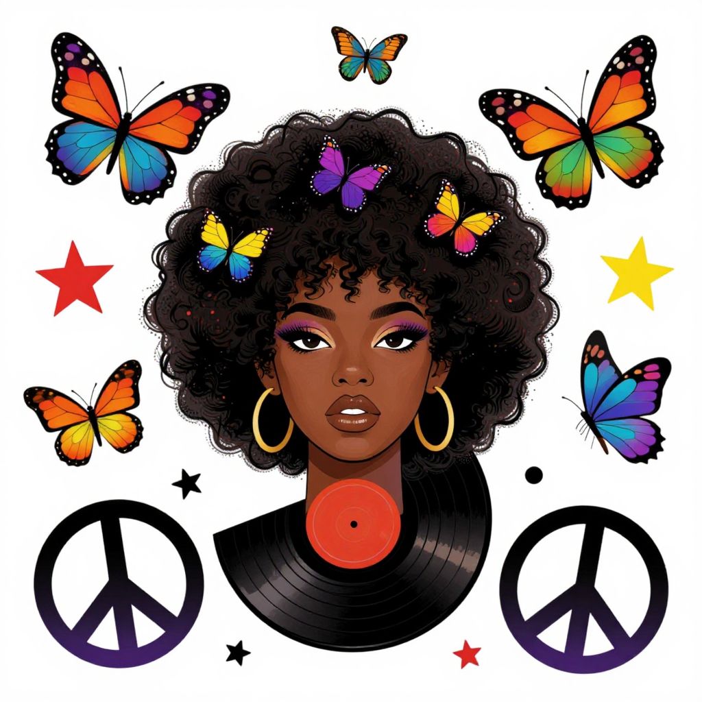 Digital illustration of a dark-skinned woman with a full, curly black afro adorned with colorful butterflies (blue, orange, yellow, purple). She has large, golden hoop earrings, bold pink eyeshadow, and glossy pink lips. Surrounding her are vibrant butterflies, a red star, a yellow star, and black peace symbols with a red vinyl record at the bottom center. The background is white, making the colorful elements pop. The style is vibrant, retro, and psychedelic, with a focus on 1970s-inspired aesthetics.