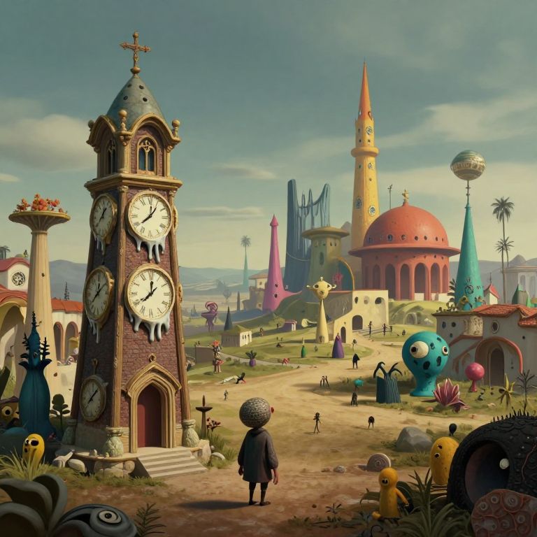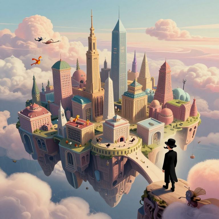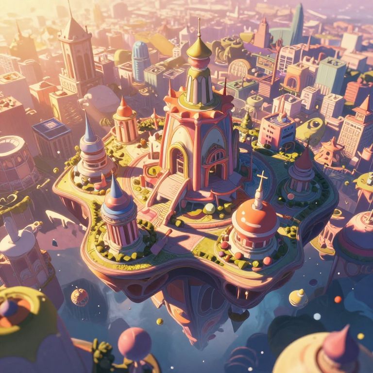 A surreal dreamscape featuring vibrant, impossible architecture with buildings spiraling into the sky like candy cane stripes. Viewed from an aerial perspective through a kaleidoscope lens, this dizzying yet mesmerizing view offers a fantastical scenery where a lone figure dressed in Victorian attire stands atop one of the twisting structures, gazing at the colorful, ever-shifting horizon. Dramatic and ethereal lighting casts long shadows into infinity, evoking wonder and unease as reality and fantasy blur in this captivating visual narrative.