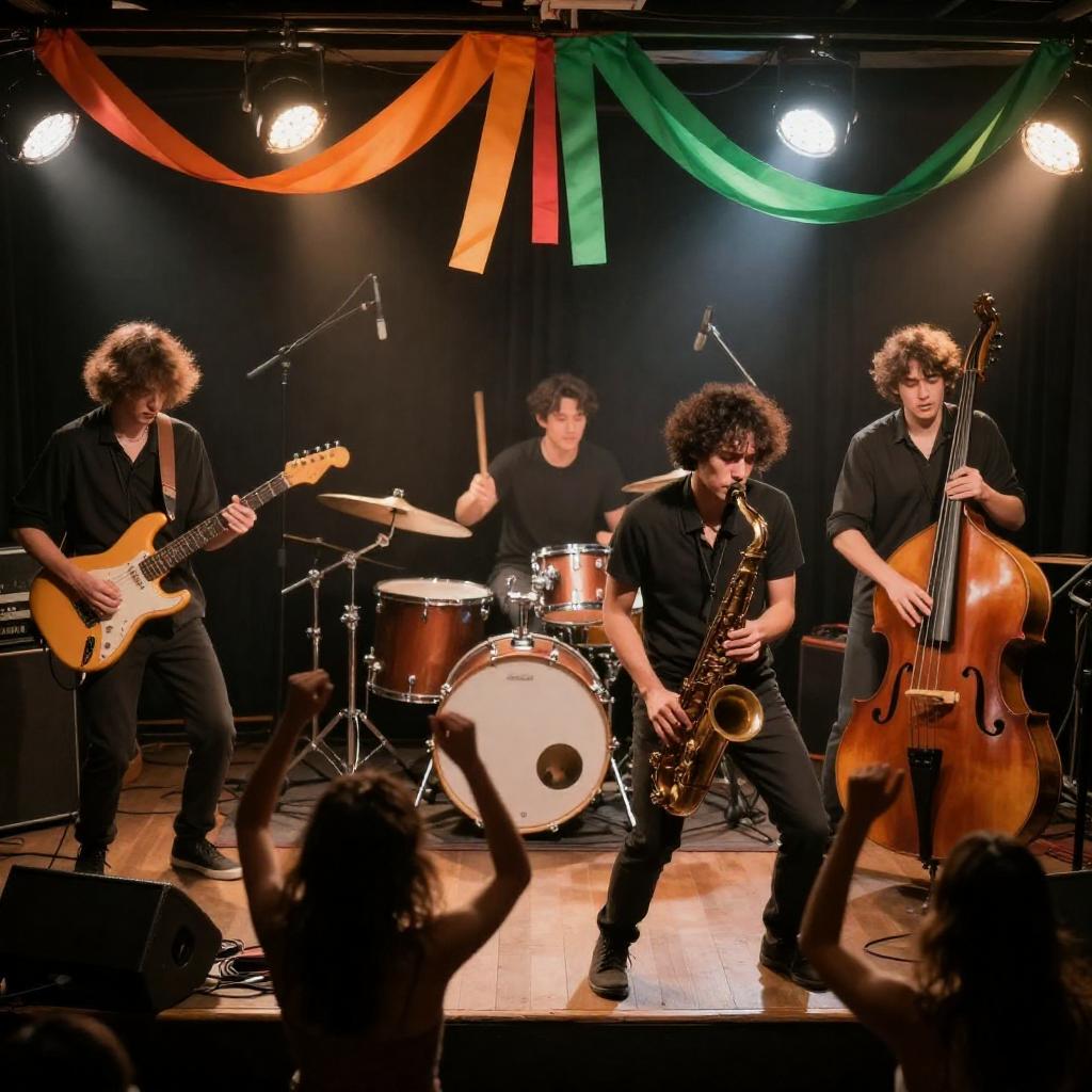 Live band performance, six musicians, dimly lit, colorful streamers overhead, drummer center, guitarist left, bassist right, saxophonist front, energetic dance crowd in foreground, bright stage lights, dynamic movement, intense expressions, drum kit, wood stage, orange and green streamers.