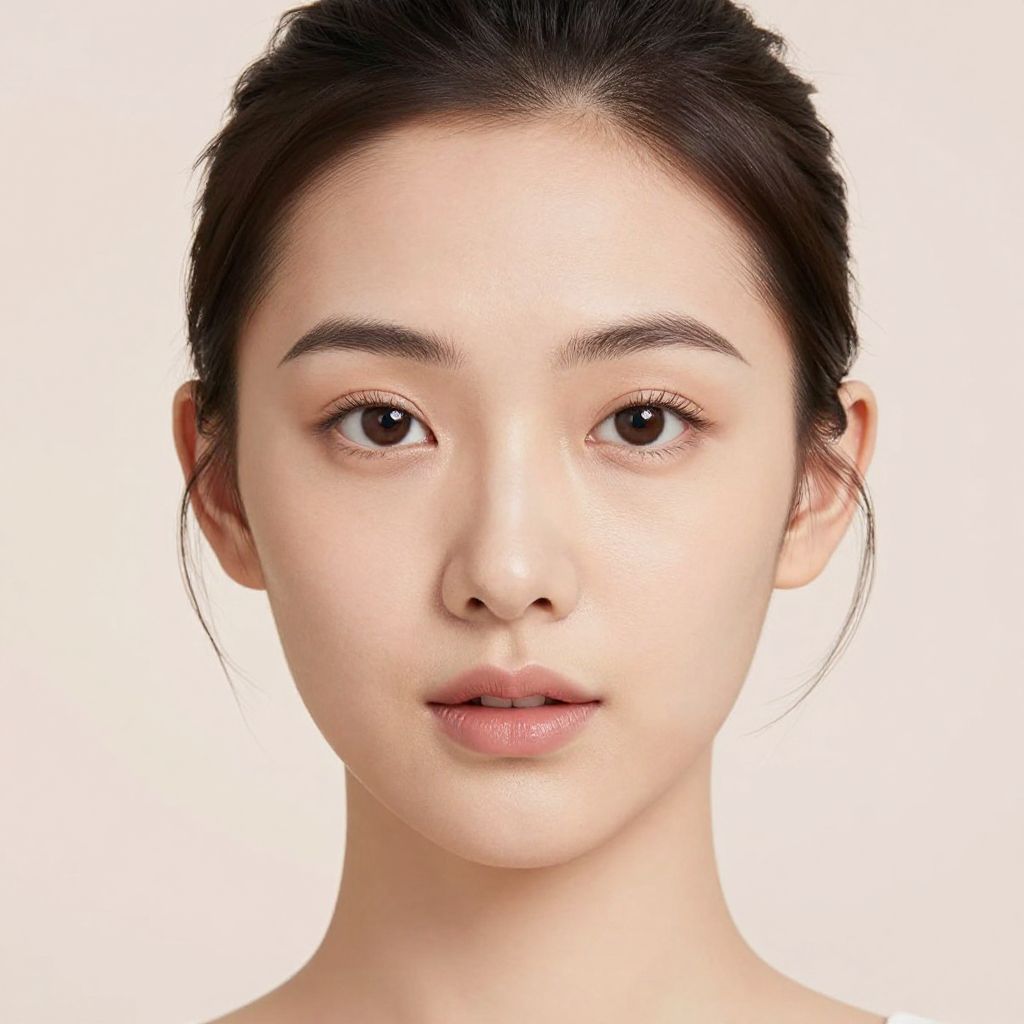 Shaved face filter on a woman's portrait, flawless clear skin with a slight matte finish, soft pastel background, natural daylight, artistic digital makeup enhancement, delicate features emphasized, highly detailed, ultra-realistic style