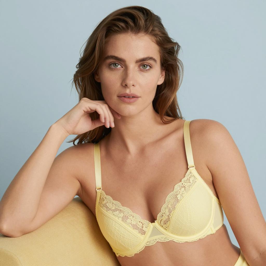 Woman in Yellow Lace Bra with Strappy Design