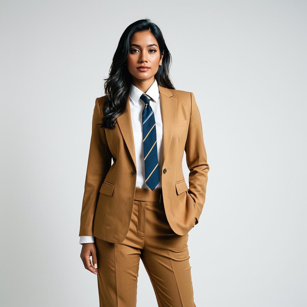 Portrait of a confident Black male model in his early 30s wearing a fitted light brown suit paired with a crisp white shirt and a patterned light brown tie. He accessorizes with a matching belt, a gold wristwatch, and a stylish pocket square. The full-body shot is taken against a clean white background with cinematic natural lighting, showcasing a professional and ultra-realistic look.