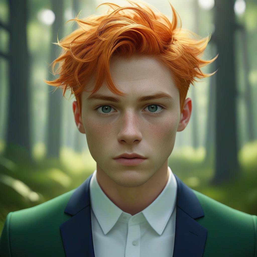 A photorealistic portrait of a young man with vibrant orange hair styled in short spiky hair, soft freckles, emerald green eyes, and glossy lips, wearing a tailored navy suit with a white shirt, set against a softly blurred forest glade, gentle natural lighting, shallow depth of field, ultra-detailed realistic rendering.