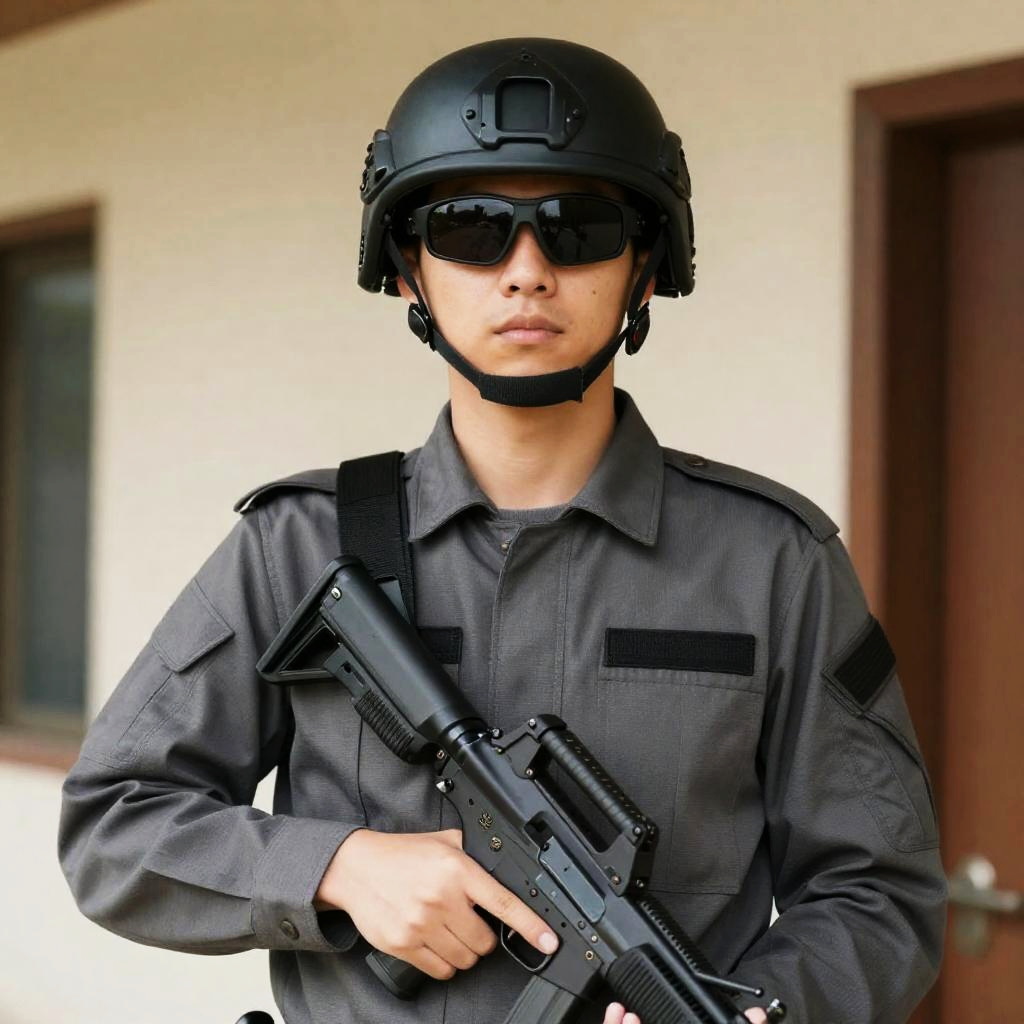 Photograph of a man in a military-style gray outfit and black helmet with sunglasses, holding a black firearm. He has a neutral expression. Background includes beige walls, wooden door frames, and a partially visible window. He is centered in the frame.