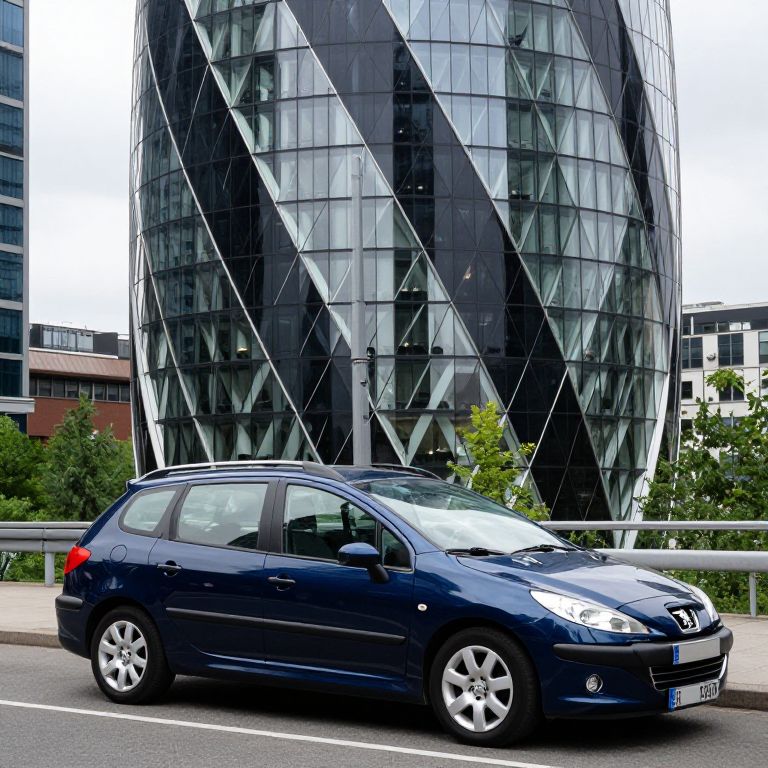 A dark blue Peugeot 307SW station wagon is parked in front of the Zaha Hadid building, taken by Andreas Levers.