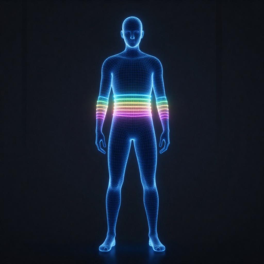 Blue wireframe silhouette of a standing person with rainbow light strips across the waist, illuminated against a dark, gradient background with vertical black lines. The figure is centered, facing forward.