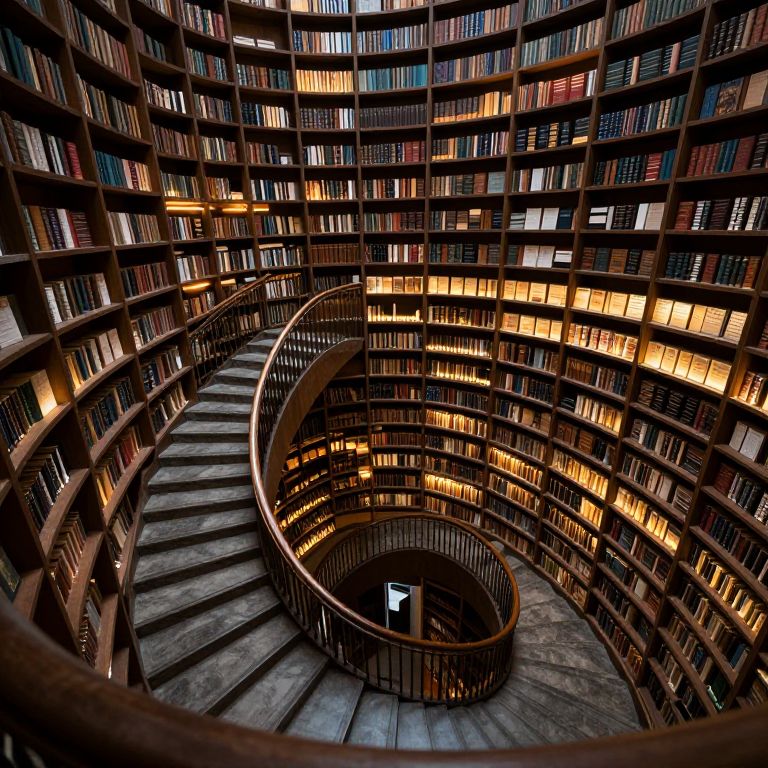 A labyrinthine library spirals infinitely upward through cascading stone staircases, its endless shelves cradling books that seem to glow faintly with secrets untold, inviting readers into a timeless realm where knowledge defies gravity and logic.
