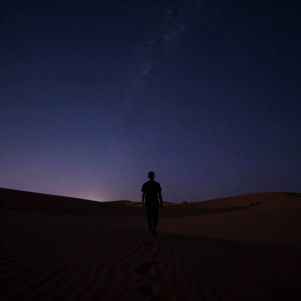 Man walking in desert at night under starry sky, silhouette against moonlit dunes, quiet and serene environment, cool blues and purples, sense of mystery and calm