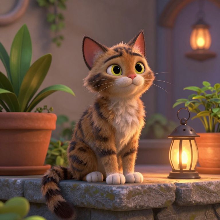 This is a digital CGI image featuring an adorable, large-eyed, orange tabby kitten with black stripes and white paws, sitting on a stone ledge. The kitten has a curious expression, looking upwards with wide, green eyes. To the right, a glowing lantern emits warm light, casting soft shadows. Potted plants with green leaves are placed on both sides of the kitten, adding a touch of nature. The background is slightly blurred, showing a dimly lit, rustic setting with a lantern hanging on the wall. The overall color palette includes warm oranges, greens, and browns, creating a cozy, evening atmosphere.