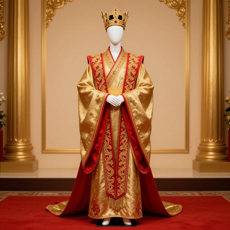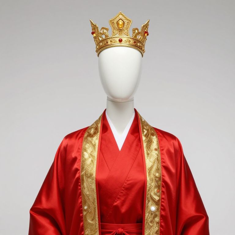 Mannequin wearing a red robe with gold accents and a gold crown on his head.