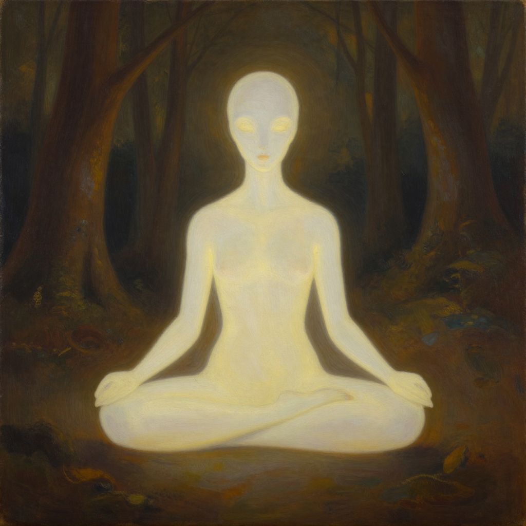 Digital painting of a glowing, ethereal, nude figure with a serene expression, sitting cross-legged in a dark, forested background.