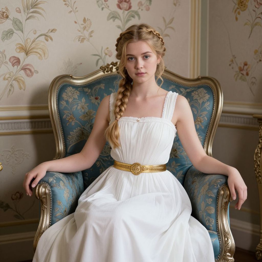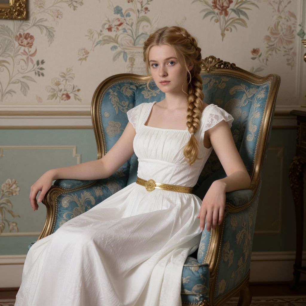 A young woman with golden braided hair sits gracefully on a richly embroidered blue armchair, her elegant white gown adorned with a gold belt, set against a backdrop of floral-patterned wallpaper in a Victorian-era interior.