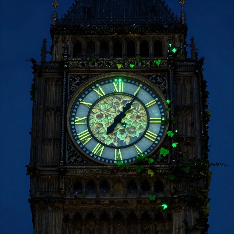 A clock tower grows devoured by ivy that tells time through bioluminescent leaves, flickering in sequences that predict the near future.