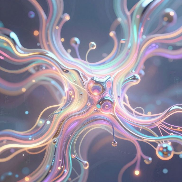 AI artflow visualization, intricate network of glowing neural connections forming colorful flowing patterns, blending organic forms with digital elements, chrome textures mixed with pastel gradients, cybernetic art, ethereal and captivating