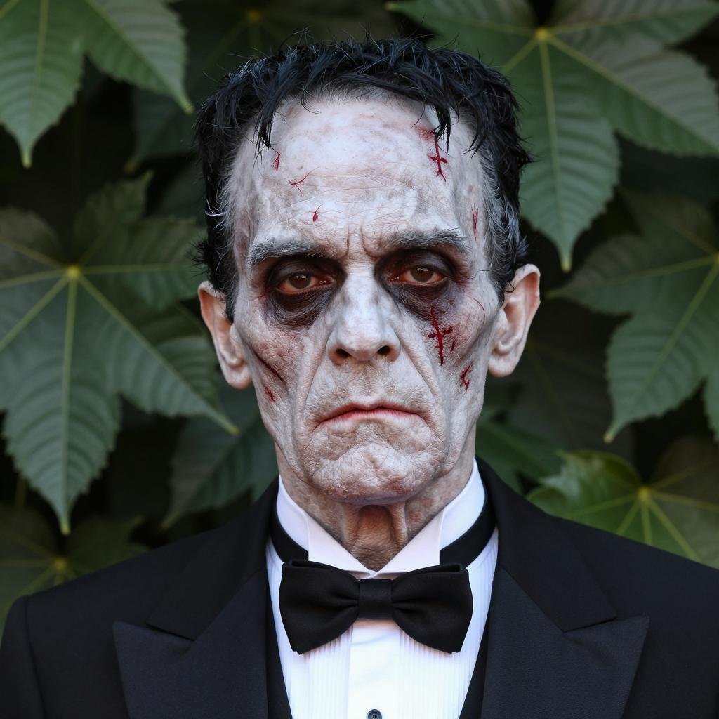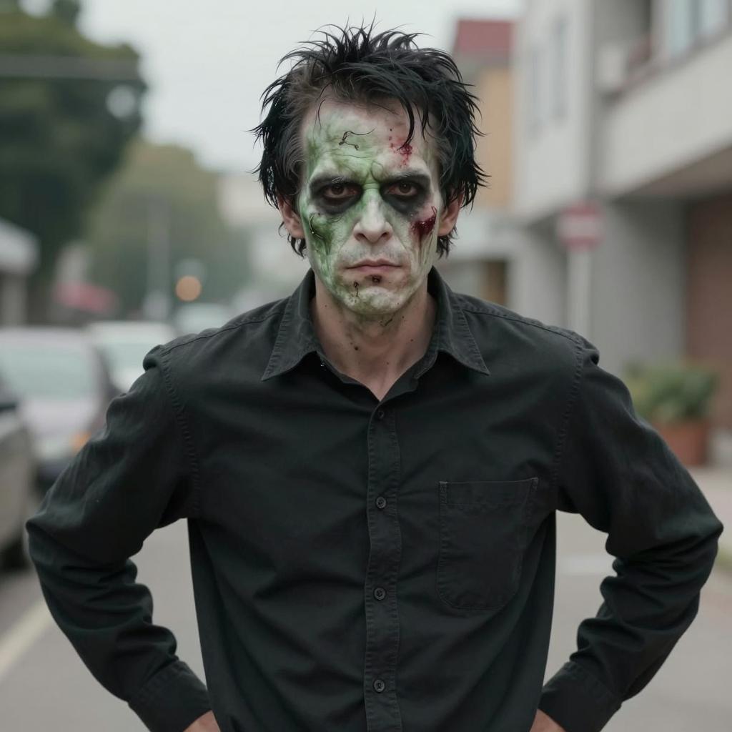 Man frankenstein costume, photograph of man with zombie makeup, black hair, greenish pale face, dark eyes, black button-up shirt, arms behind back, outdoor setting, blurred background, realistic style, horror character, daytime, serious expression, slight smirk, color contrast between skin and shirt